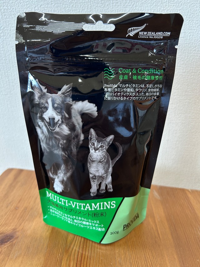 こんな商品を待っていました! ペット用のビタミンサプリを探してはいましたが、これだ!というものは長年見つけられませんでした。 この商品には、 ビタミンA ビタミンD ビタミンE ビタミンC ビタミンB1、B2、B3、B6、B12 DHA プレバイオティクス 亜鉛 などが入っており、これらは体の運動機能や関節の健康、丈夫な皮膚や美しい被毛、 視力や脳など神経系の器官の健康、口内環境や腸内環境、免疫機能の維持などに 必要な栄養成分です。 実はペットがビタミン不足になっているかもしれないという懸念がありました。 ペットフードに含まれていますよという声がありますが、 それでは賄えないくらいにビタミンを体内で使ってしまっているのではないかと考えています。 そうした中で、この商品は健康に過ごしてもらうためのアイテムとして適しているわけです。 フリーズドライ製法で、美味しさや栄養がそのまま 混ぜものなしで素材100% 人工保存料・着色料は一切使用なし 犬種や猫種、年齢を問わず幅広くお勧め 食材はすべて人間食用を使用 1日1回、体重に合わせて、以下の量を目安に、フードに振りかけて与えてください。 (50gサイズ:付属の小さじ1杯で約1g、200gサイズ:付属の小さじ1杯で約5g) 個体差がありますので、様子を見ながら調整してください。 また、粉末タイプのサプリメントですので、フードに適度な水分が含まれている方が、より与えやすくお勧めです。 ・体重1kg:0.5g、2kg:1g、3kg:1.5g、5kg:2.5g、10kg:5g、20kg:10g、30kg:15g /1日分 ※目安量としては、体重2kgあたり1g(体重の半分をグラムに置換え)が1日分です。 例)体重4kg→50gで約25日分 例)体重4kg→200gで約100日分 【原材料】 アマニの実(繊維質)、DHA ゴールド、フラクトオリゴ糖、イヌリン、ビタミン E、 キウイフルーツエキス、タウリン、ビタミン B12、ビタミン C、有機亜鉛、ビタミン B6、 ビタミン B3(ナイアシン)、ビタミン B1、ビタミン B2、ベータカロチン、ビタミン A、ビタミン D 【栄養情報】 ビタミンA 500iu 有機亜鉛 5mg ビタミンD 50iu ベータカロチン 5mg ビタミンC 25mg 天然ビタミンE 50iu タウリン 100mg プレバイオティクス 2000mg DHAゴールド 1000mg ビタミンB1 10mg ビタミンB2 4mg ビタミンB3(ナイアシン) 15mg ビタミンB6 15mg ビタミンB12 0.8mg